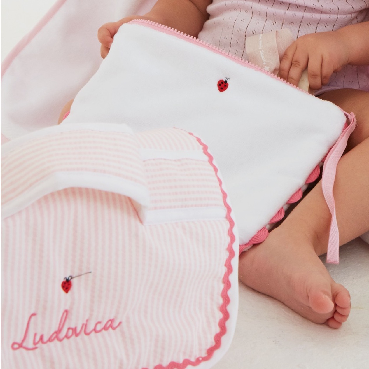 E’ realizzata con un morbido tessuto in spugna di cotone, dalla grammatura consistente, decorata dall’iconica coccinella e dalla nostra ondina in versione XL. Doppiata in tessuto trapuntato, con cerniera colorata a contrasto, è pensata per accompagnare le mamme durante la stagione estiva.