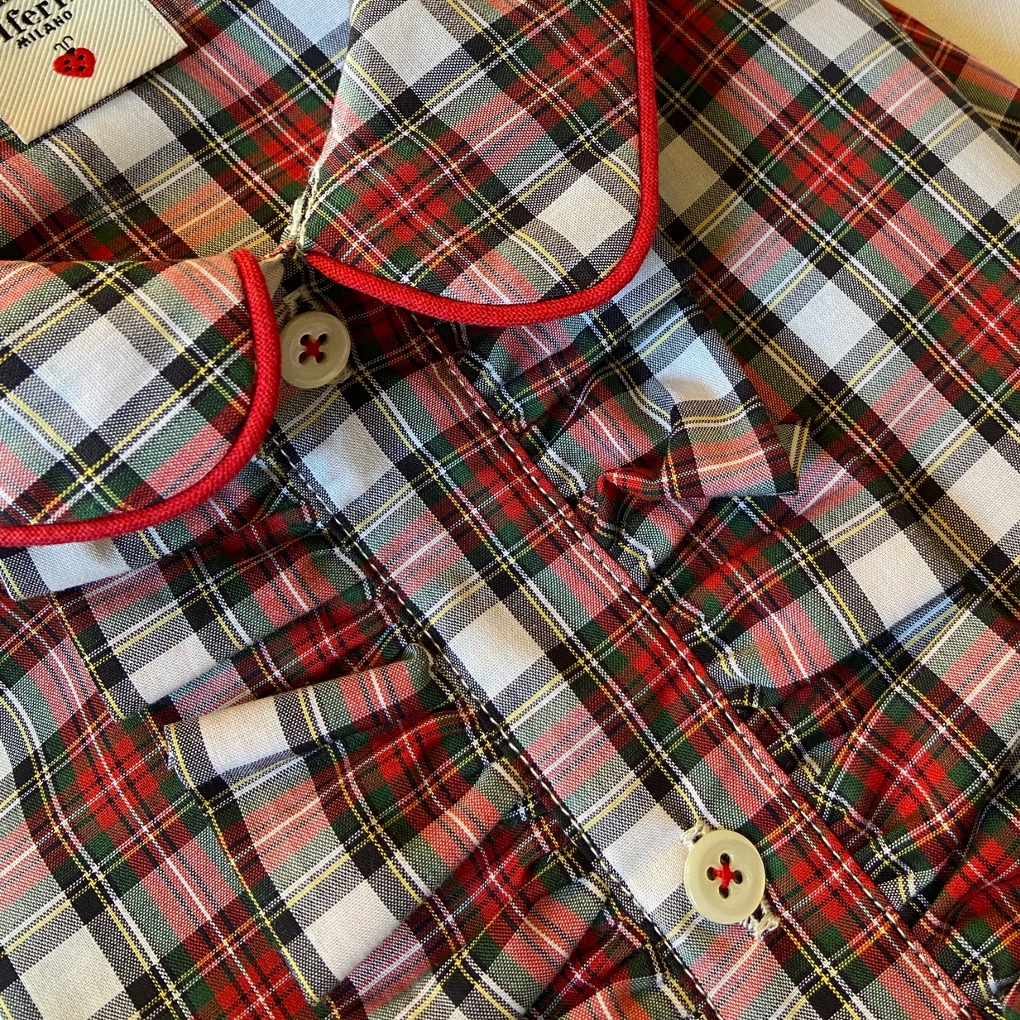 - Colletto con pettorina, maniche lunghe, chiusura frontale con bottoni.
