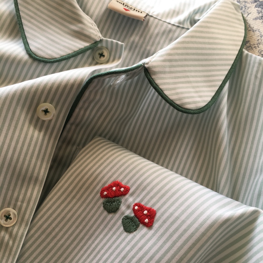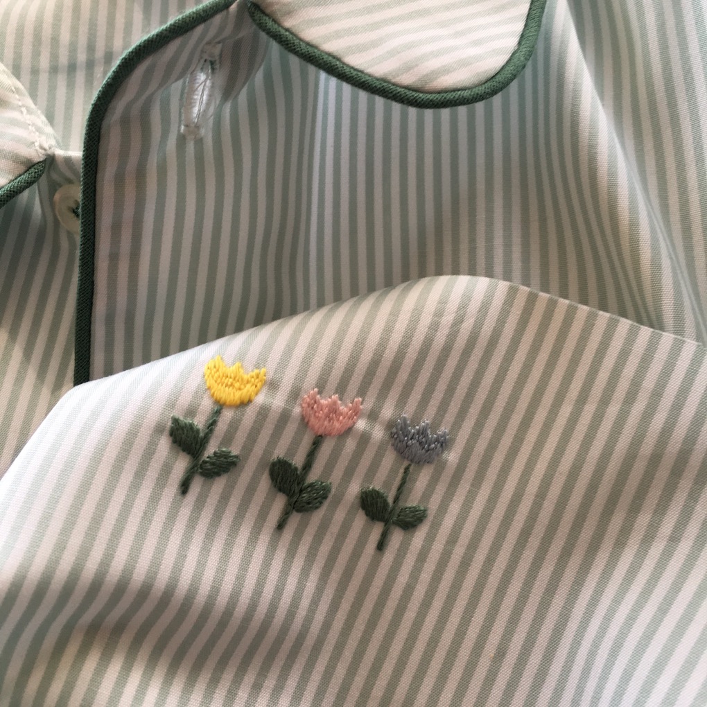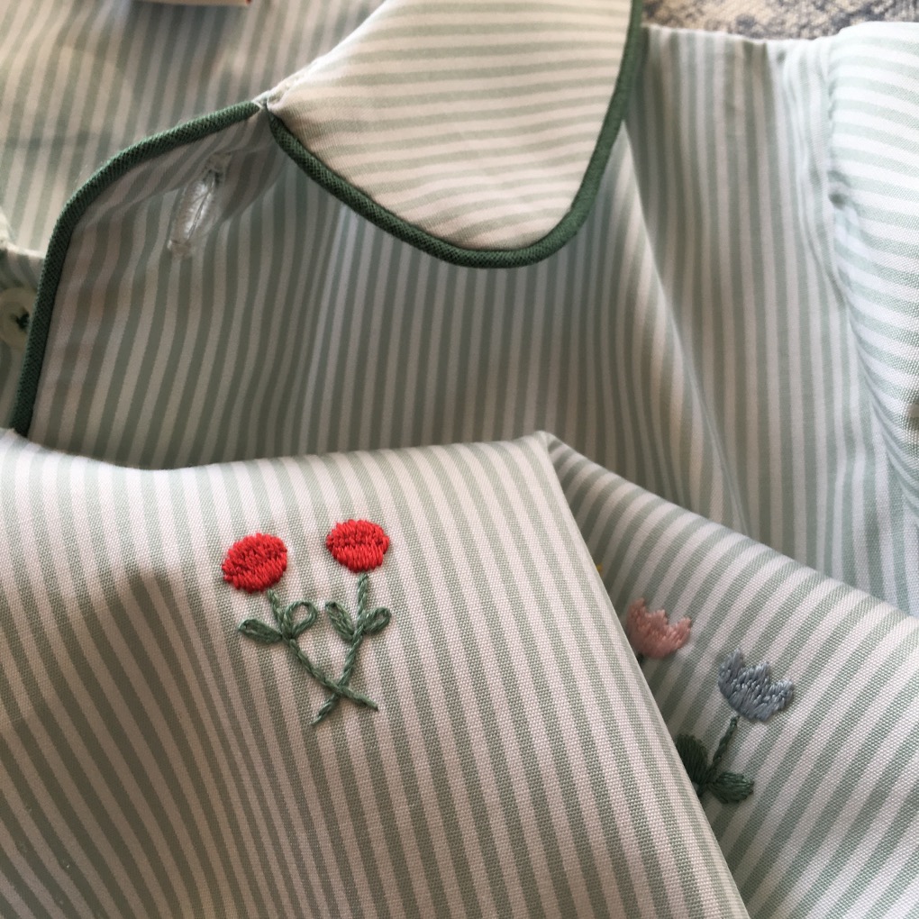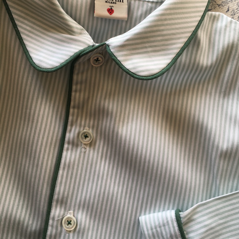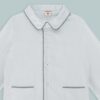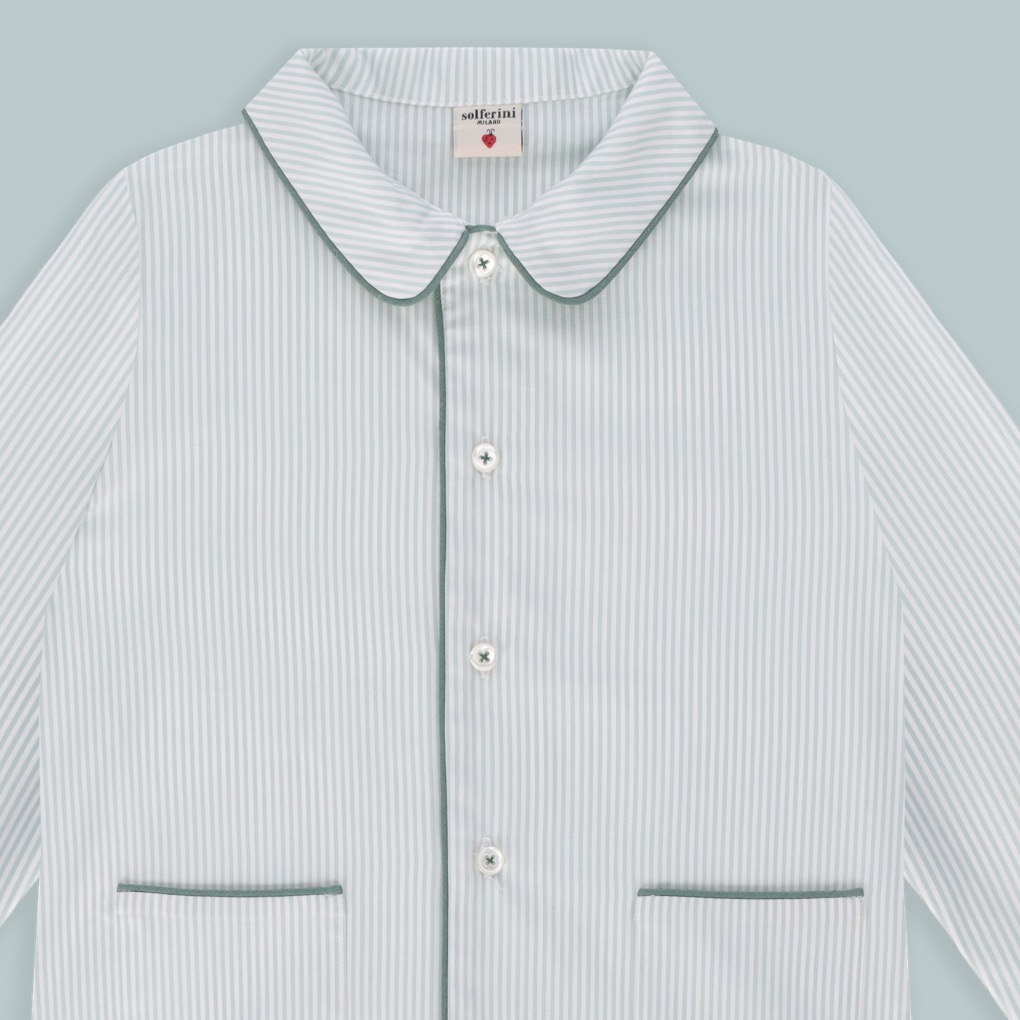 - Colletto con pettorina, maniche lunghe, chiusura frontale con bottoni, taschina applicata.